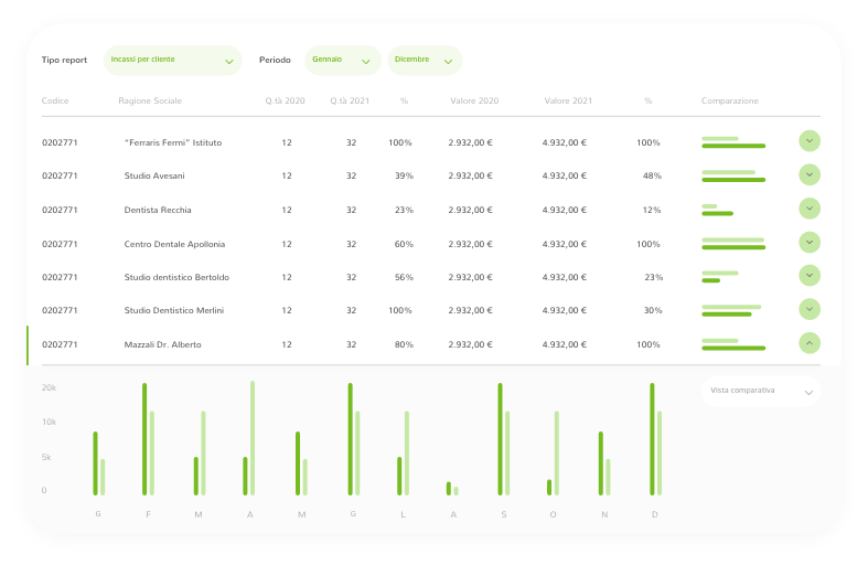 La lista clienti può essere filtrata in base ai dati di profilazione raccolti, come ad esempio visualizzare tutti i clienti con un particolare tipo di specializzazione o in base alle attrezzature utilizzate. L’integrazione è effettuata direttamente sul CRM, tramite una chiamata agli endpoint Applicativi.